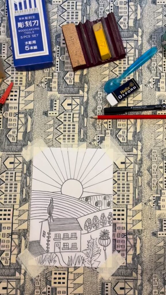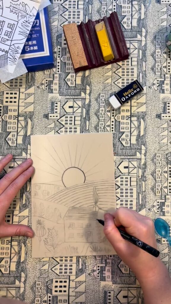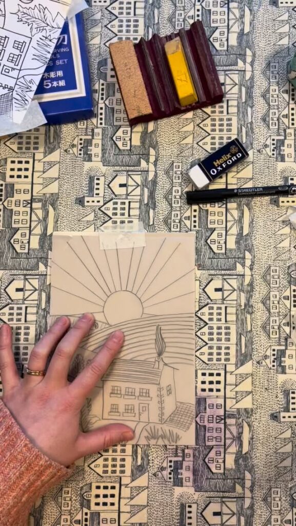 I sketch original designs, transfer them onto lino blocks, carve them by hand and print them by hand using relief printmaking inks and a press or baren.